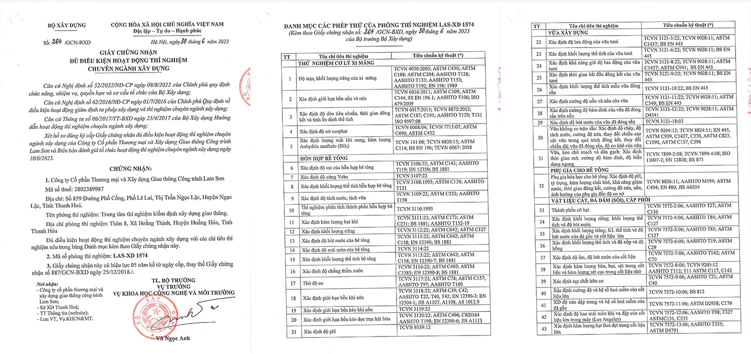 4 - Giấy chứng nhận đủ điều kiện hoạt động thí nghiệm chuyên ngành xây dựng Bộ Xây Dựng: Chứng nhận số 264/GCN - BXD của Bộ Trưởng Bộ Xây Dựng ngày 30 tháng 06 năm 2023 về việc: Chứng nhận đủ điều kiện, năng lực hoạt động thí nghiệm chuyên ngành xây dựng. Chứng nhận Trung tâm thí nghiệm kiểm định xây dựng giao thông thuộc Công ty CP thương mại và xây dựng giao thông công trình Lam Sơn mã số LAS - 1574.